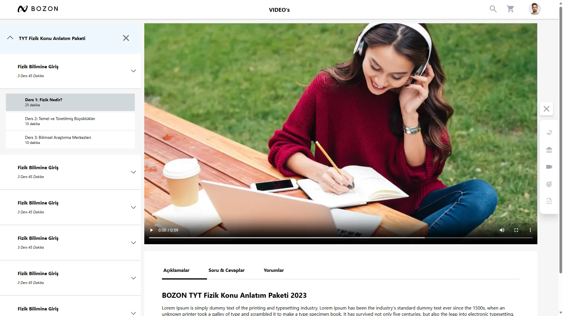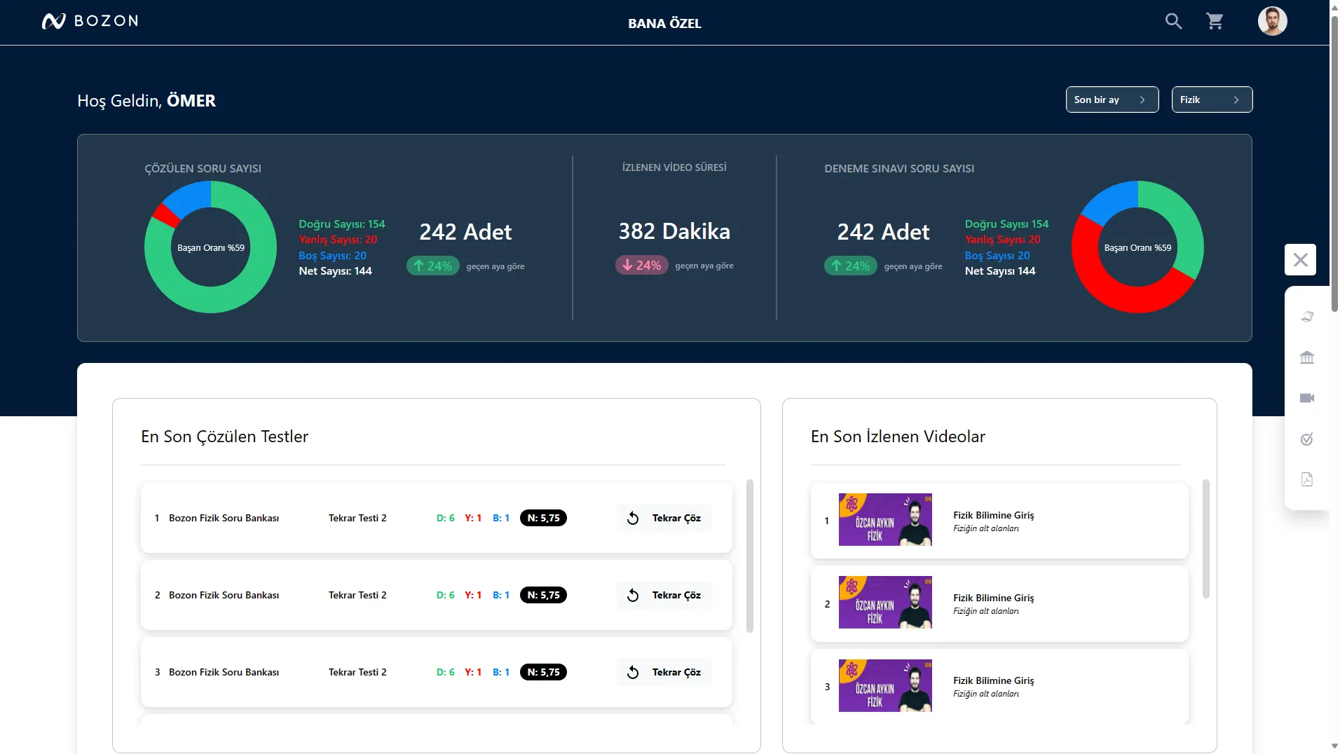 Bozon eğitim portalı, 9. sınıf müfredatından TYT/AYT sınavlarına kadar olan tüm süreçte öğrencilere eğitim imkanları sunmaktadır. Platform üzerinde öğrenciler testleri çözebilir, özel kanvas tahtası ile ekran üzerinde çizim yapabilir, ders anlatım ve video anlatım modülü ile bilgilerini pekiştirebilirken özel paneli ile mevcut performanslarını görüntüleyebilirler. İkidijital olarak proje için ön yüz geliştirmesi yapıldı. Mobil, tablet ve masaüstü tarayıcılar ile uyumlu olacak şekilde geliştirilirken performans optimizasyonları da uygulandı. Kullanıcıların rahat bir şekilde çizim yapabilmesi için özel kanvas oluşturuldu ve mevcut istatistiklerini görebilmeleri için özel grafikler geliştirildi.