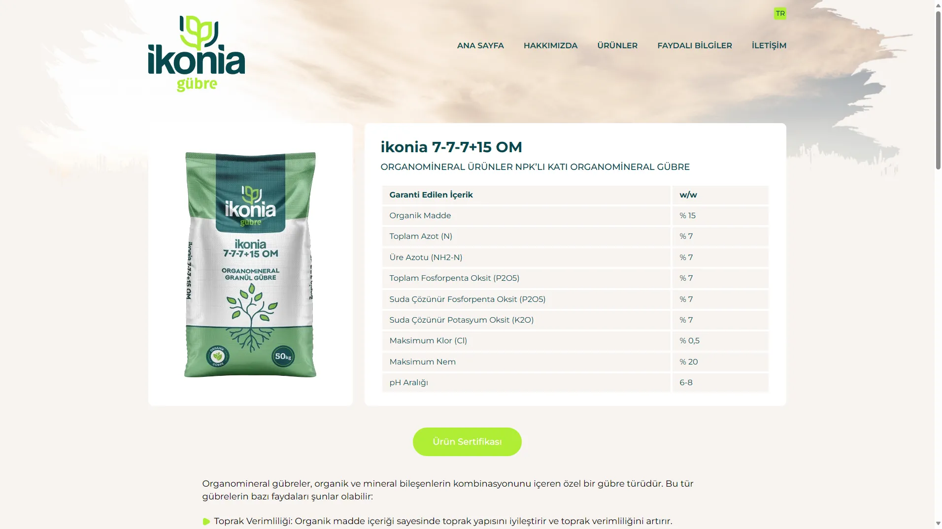 İkonia Gübre, tarım sektörüne özel takviye kıta organomineral gübreler üreten firmadır. Dünyanın dört bir yanına ürünlerini gönderen İkonia için dil ve bilgi aktarımı, önemli faktörlerdendir. Bunun için Türkçe, İngilizce, Arapça ve Rusça olacak şekilde çoklu dil desteği sağlayan bir altyapı sunuldu. Özellikle Arapça kullanan kullanıcılar için sistemin tam anlamıyla sağdan sola olması, büyük zorluklardan birisidir. En verimli şekilde Arapça gibi sağdan sola yazılan dillerde, sitenin hiyerarşisi ve görünümü bozulmadan sağdan sola görünüm sağlandı. Ayrıca kullanım alanları gibi yoğun bilgi içeren alanların en verimli şekilde görünmesi sağlandı.